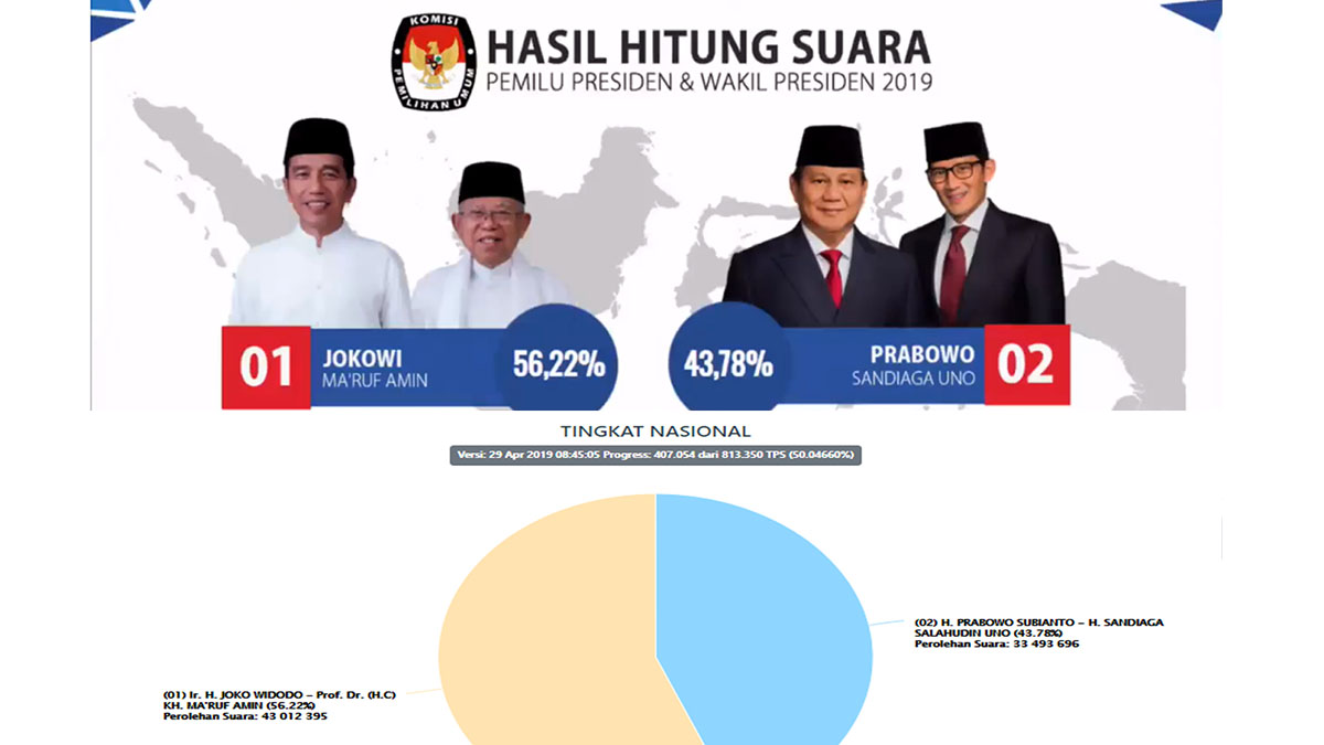 Hasil Hitung KPU untuk Pilpres 2019, suara yang masuk sudah mencapai 50%, hingga Senin (29/4/2019) jam 08.45 WIB.