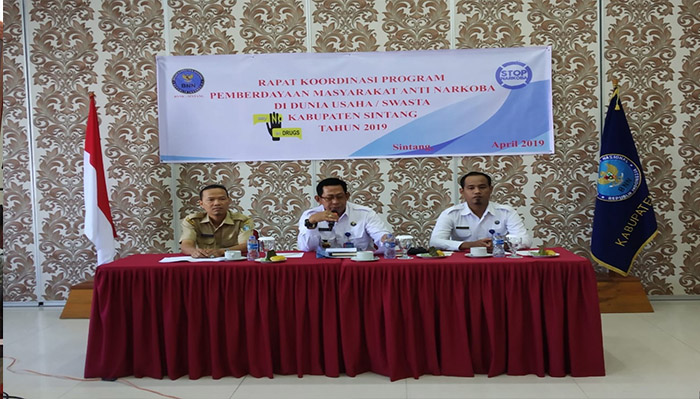 SINTANG - Badan Narkotika Nasional (BNN) Kabupaten Sintang menggelar Rapat Koordinasi Pemberdayaan Masyarakat Anti Narkoba di Dunia Usaha/Swasta Kabupaten Sintang Tahun 2019 yang digelar di My Home Sintang, Selasa (30/4/2019) pagi.