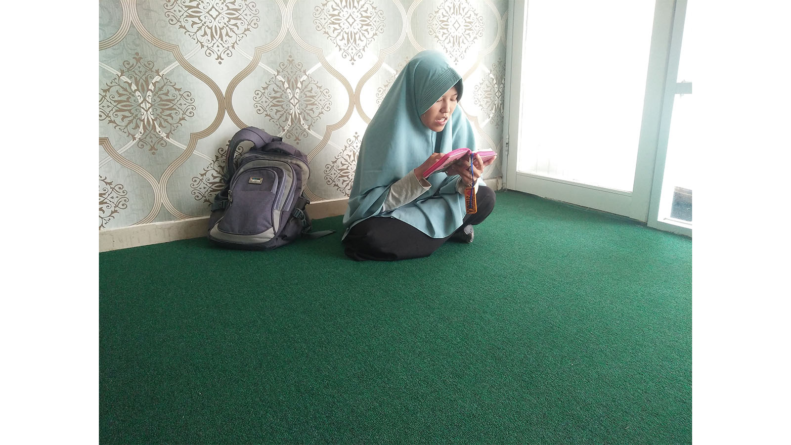 Syahidah Nur Auliyah (20) Mahasiswa Fisipol Untan Pontianak tampak khusuk membaca Alquran di musala SPBU jalan Paris 2 Pontianak.