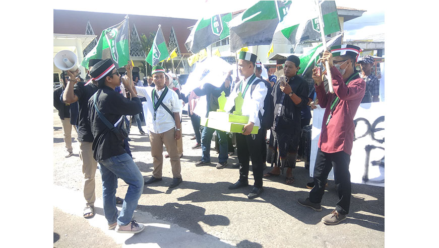 Saat berorasi mereka membawa properti berupa 'kuburan' sebagai simbol protes dalam aksi mereka.