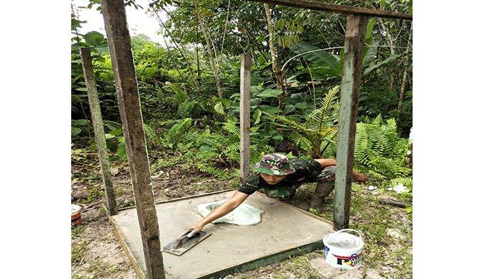 BENGKAYANG - Bintara Pembina Desa (Babinsa) Koramil 1202-07/Seluas Kodim 1202/Singkawang, membangun jamban sebagai realisasi program jambanisasi bagi masyarakat yang kurang mampu, di Dusun Plangor, Desa Kalon, Kecamatan Seluas, Kabupaten Bengkayang, Sabtu (15/6/2019).