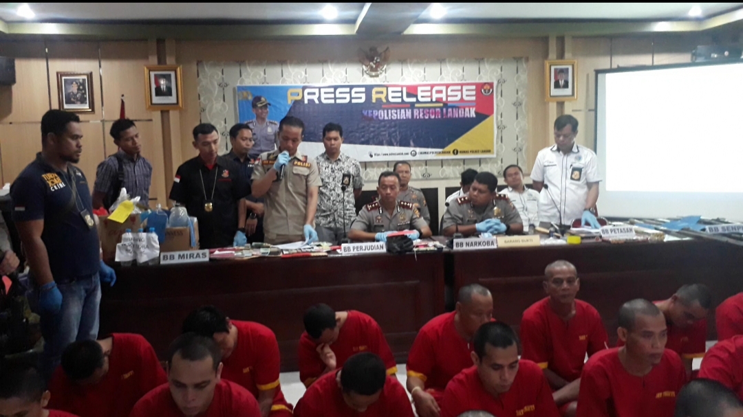 LANDAK - Polres Landak melaksanakan press release hasil pengungkapan kejahatan dari bulan Mei dan operasi pekat yang berlangsung di Mapolres Landak pada Kamis (4/7/2019).