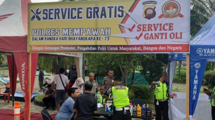 MEMPAWAH - Dalam rangkaian peringatan Hari Bhayangkara ke 73, Satuan Lalulintas Polres Mempawah membagikan dan mengadakan servis motor gratis, Kamis (4/7/2019) kemarin.