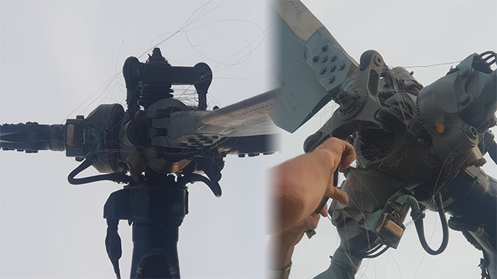 Tali layangan tersangkut di beberapa bagian helikopter.