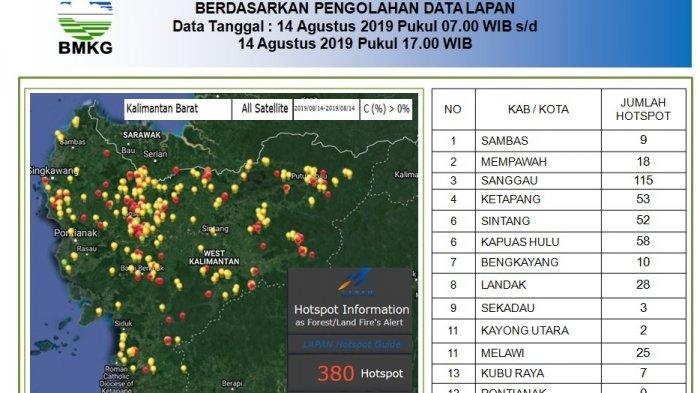 KUBU RAYA- Badan Meteorologi, Klimatologi, dan Geofisika (BMKG) saat di hubungi wartawan tribun pontianak mengatakan berdasarkan data, hari ini titik hotspot di kalbar terpantau 380 titik, Rabu (14/08/2019).