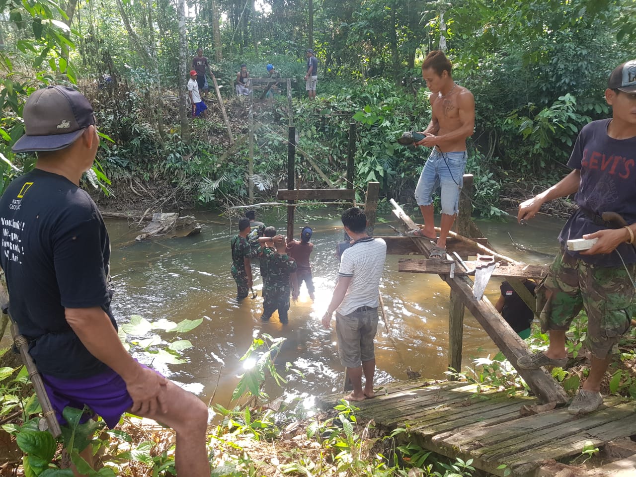 SAMBAS - Bantu kesulitan warga di perbatasan ujung Negeri, Anggota Satgas Pamtas Yonmek 643/Wanara Sakti Pos Koki SSK 2 bersama warga melaksanakan karya bhakti pembangunan jembatan (Sungai Sajingan) yang terletak di Desa Kaliau, Kec. Sajingan Besar pada Sabtu (24/8/2019)