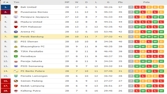 Sedangkan, satu poin tambahan membuat Barito Putera juga bertahan di posisi 14 dengan total 31 angka hasil dari 28 laga.
