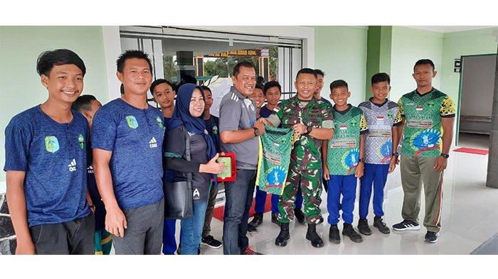 SINTANG - Dandim 1205/ Sintang, Letnan Kolonel Inf Rachmat Basuki memberikan satu set Jersey/ kaos bola kepada tim PS Gelora U 12 yang akan berlaga mengikuti turnamen Liga Muda U - 12 Tingkat Nasional di Jakarta pada 16-18 Desember 2019 mewakili Kalimantan Barat.