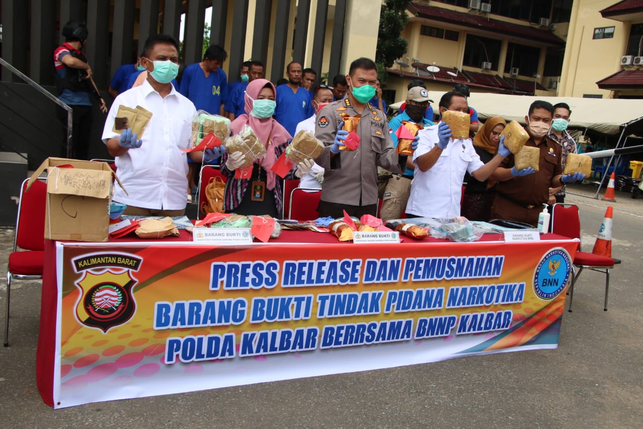 PONTIANAK – Kepolisian Daerah Kalimantan Barat bersama Badan Narkotika Provinsi Kalimantan Barat melakukan pemusnahan barang bukti pengungkapan kasus narkotika.