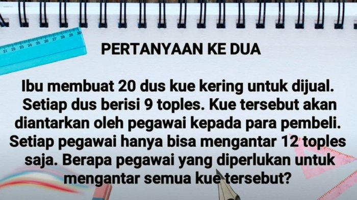 Ibu membuat 20 dus kue kering untuk dijual. Setiap dus berisi 9 toples. Kue tersebut akan diantarkan oleh pegawai kepada para pembeli. Setiap pegawai hanya bisa mengantar 12 toples saja. Berapa pegawai yang diperlukan untuk mengantar semua kue tersebut?