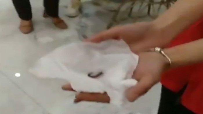 Cuplikan dari sesi hukuman menunjukkan seorang karyawan memegang salah satu cacing yang menggeliat di atas selembar tisu di telapak tangannya.