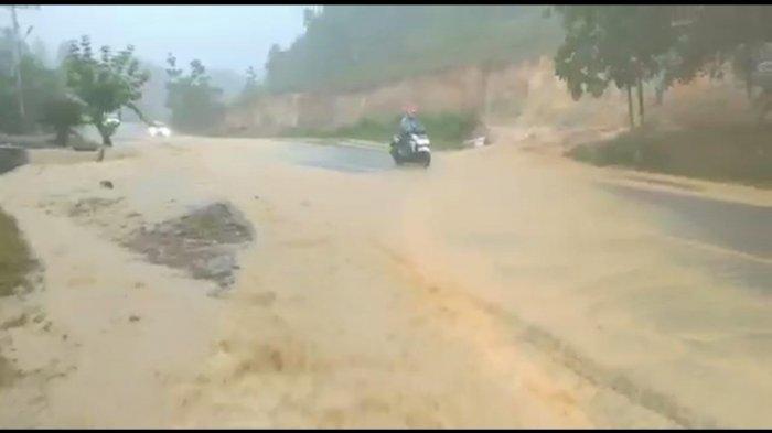 TRIBUNPONTIANAK.CO.ID, SANGGAU - Hujan deras yang melanda Kota Sanggau dalam sepekan terakhir mengakibatkan adanya luapan air di tanjakan Semboja, Jalan Jenderal Sudirman, Kelurahan Bunut, Kecamatan Kapuas, Kabupaten Sanggau, Kalbar, Sabtu (6/6/2020).