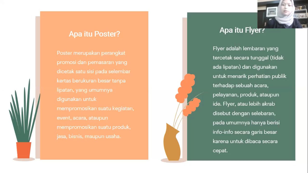 Ia memberikan penjelasan mengenai konsep dasar desain dan juga mempraktikkan cara pembuatan poster dan flyer dengan cara yang mudah.