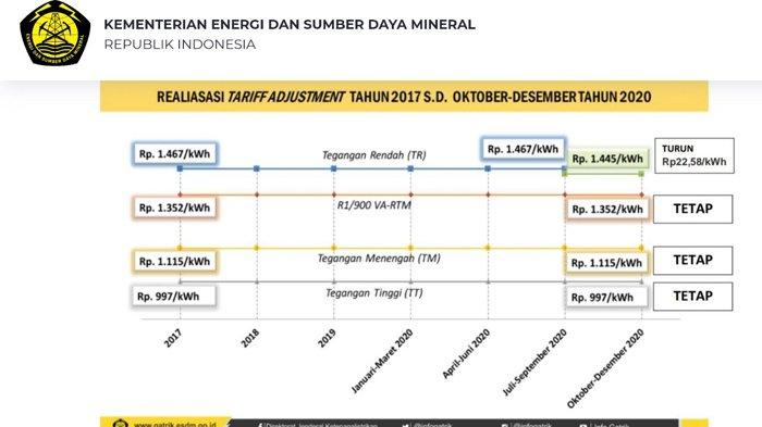 Dengan hal ini maka harga per/KWh untuk tarif golongan rendah yang sebelumnya 1.467/kWh kini turun menjadi 1.444,70/kWh atau turun 22,5/kWh. Penetapan ini berlaku untuk bulan Oktober sampai Desember 2020.