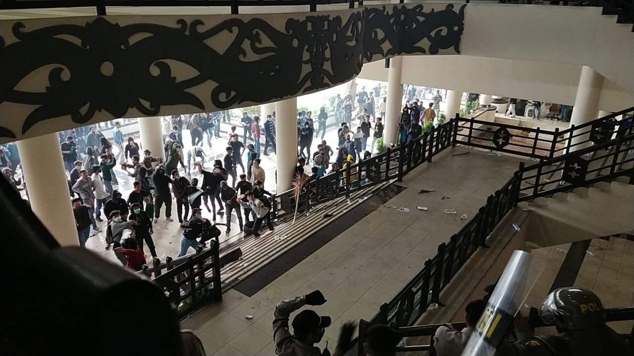 TRIBUN PONTIANAK.CO.ID, PONTIANAK - Aksi demonstrasi penolakan Undang Undang Omnibus Law di kantor DPRD Provinsi Kalbar berujung ricuh. Kamis 8 Oktober 2020.