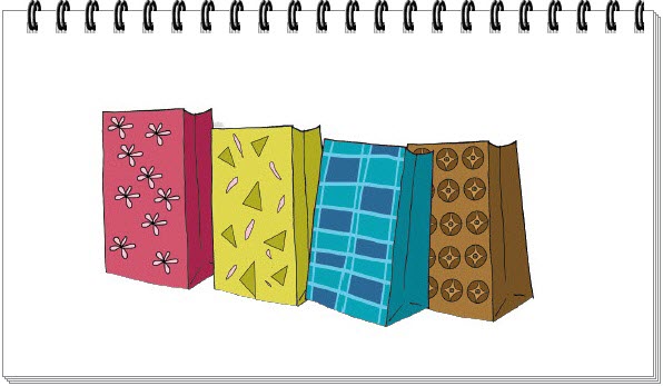 Lihatlah kantong kertas yang dibawa Lani! Sebutkan bentuk-bentuk motif yang ada pada hiasan kantong kertas! Sebutkan warna yang ada pada hiasan kantong kertas!