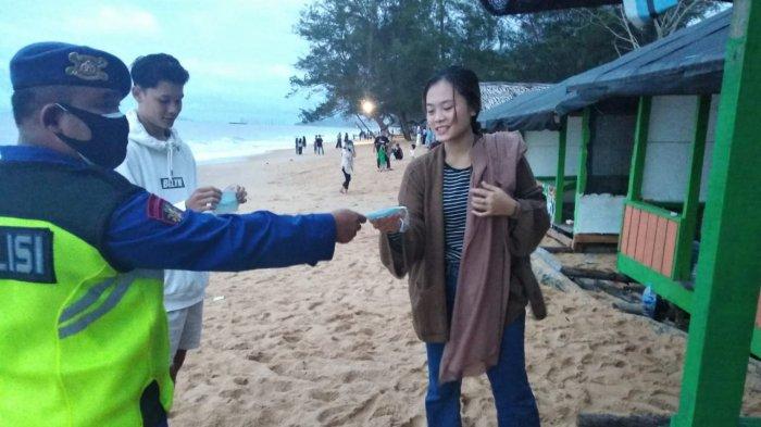 Personel Sat Polair Polres Bengkayang langsung membagikan masker kepada pengunjung pantai dalam upaya untuk mencegah terjadinya penyebaran Covid-19