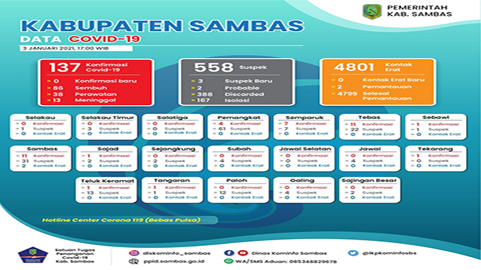 Kata dia, sesuai data yang direkap oleh Dinkes Sambas per-hari ini tidak ada tambahan kasus baru Covid-19 di Kabupaten Sambas, Senin 4 Januari 2021.