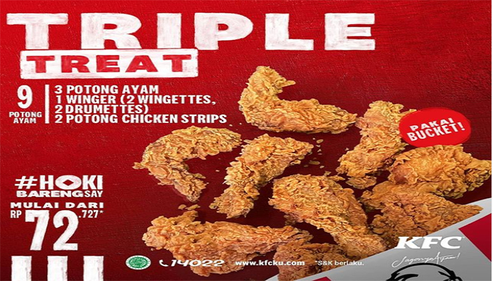 Promo yang bertajuk Triple Treat ini menawarkan 9 potong ayam mulai dari harga Rp 72.727.
