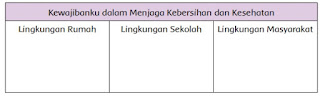 Tuliskan kembali kewajibanmu dalam menjaga kebersihan dan kesehatan lingkungan rumah, sekolah, dan masyarakat. Masukkan ke tabel berikut. Tempelkan tabel tersebut di tempat yang mudah kamu baca dan jadikan sebagai pengingatmu.