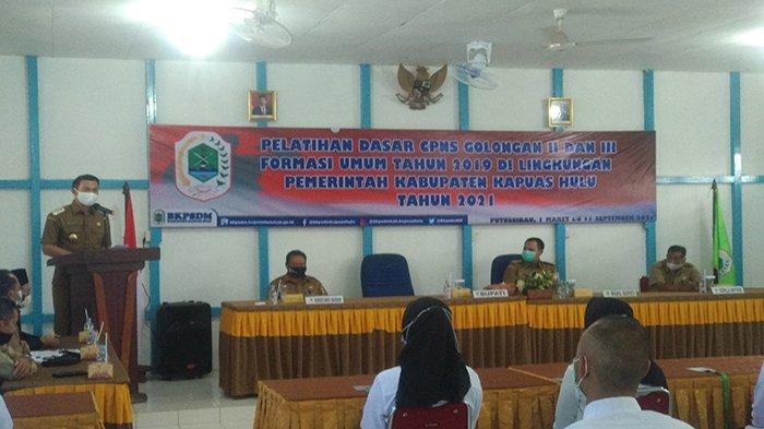 TRIBUNPONTIANAK.CO.ID, KAPUASHULU - Hari pertama masuk kerja setelah dilantik, Bupati Kabupaten Kapuas Hulu Fransiskus Diaan, yang didampingi oleh Wakilnya Wahyudi Hidayat, membuka langsung acara pelatihan dasar CPNS golongan II dan III Formasi Umum Tahun 2019, di lingkungan Pemerintah Kabupaten Kapuas Hulu tahun 2021, di Aula Hotel Uncak Lestari Putussibau, Senin 1 Maret 2021.