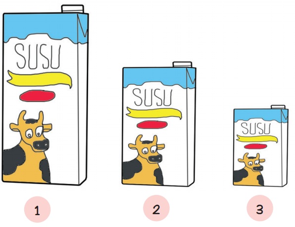 Urutkan kotak susu di atas mulai dari kotak yang bervolume paling sedikit hingga kotak yang