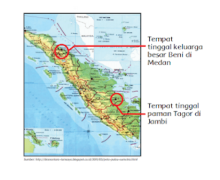 1. Lingkarilah letak tempat tinggal paman Tagor di Jambi! Lingkarilah tempat  tinggal keluarga besar Beni di Medan!