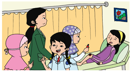 Siti bersama teman-temannya membawa Dayu ke ruang Unit Kesehatan Sekolah (UKS). Siti disambut petugas dari dokter kecil dan didampingi Ibu guru.