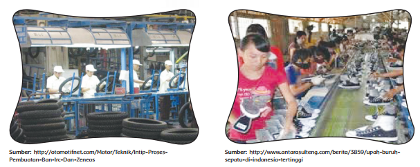 Pada gambar kedua terlihat sebagian besar buruh yang bekerja pada pabrik sepatu adalah perempuan. Namun, di sana juga terlihat ada pekerja laki-laki. Pada gambar pertama terlihat bahwa pekerja di pabrik ban didominasi oleh laki-laki. Kesamaan pada kedua gambar adalah adanya pekerja lakilaki pada kedua pabrik tersebut.