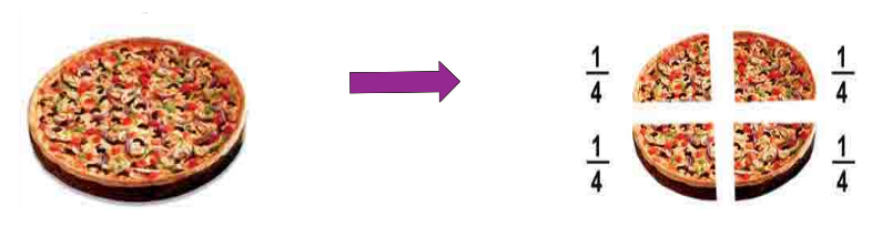 Contoh potongan Pizza yang menunjukkan masing-masing dibagi 1/4 bagian.