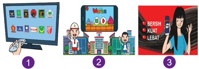 1. Iklan di televisi menayangkan gambar partai-partai politik dalam Pemilu 2014. Iklan tersebut, untuk mengenalkan kepada khalayak tentang partai-partai politik peserta Pemilu tahun 2014. Melalui iklan tersebut masyarakat dapat mengetahui partai-partai politik yang akan mereka pilih sesuai hati nuraninya tanpa adanya paksaan dari pihak mana pun. Iklan pada gambar termasuk jenis iklan politik.