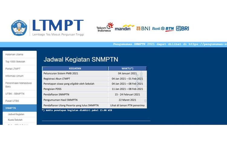 Laman resmi untuk pengumuman hasil SNMPTN 2021 dapat diakses di https://pengumuman-snmptn.ltmpt.ac.id/ (KLIK LINK)