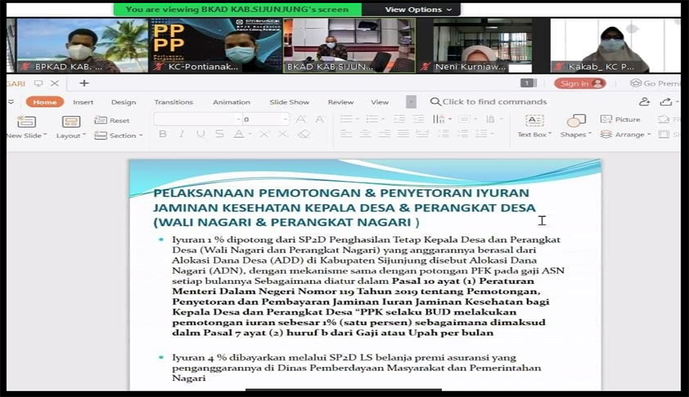 Kepala Badan Keuangan dan Aset Daerah Kabupaten Sijunjung Endi Nazir memaparkan materi terkait Mekanisme Pemotongan dan Penyetoran Iuran Jaminan Kesehatan Untuk Kepala dan Perangkat Desa yang telah terlaksana di Kabupaten Sijunjung Provinsi Sumatera Barat sesuai dengan Peraturan Menteri Dalam Negeri Nomor 119 Tahun 2019 tentang Pemotongan, Penyetoran dan Pembayaran Iuran Jaminan Kesehatan Bagi Kepala dan Perangkat Desa.