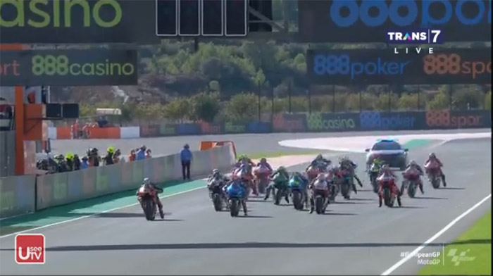 Saat ini, sedang berlangsung siaran live Moto2 di Trans7, dan live race dimulai pukul 22.20 WIB.