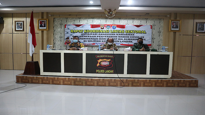 TRIBUNPONTIANAK.CO.ID, LANDAK - Guna antisipasi gangguan Kamtibmas dan mencegah penyebaran wabah Covid-19 pada peringatan hari wafat Isa Almasih 2021 di wilayah Kabupaten Landak, Polres Landak laksanakan Rapat Koordinasi (Rakor) lintas sektoral pada Selasa 30 Maret 2021.