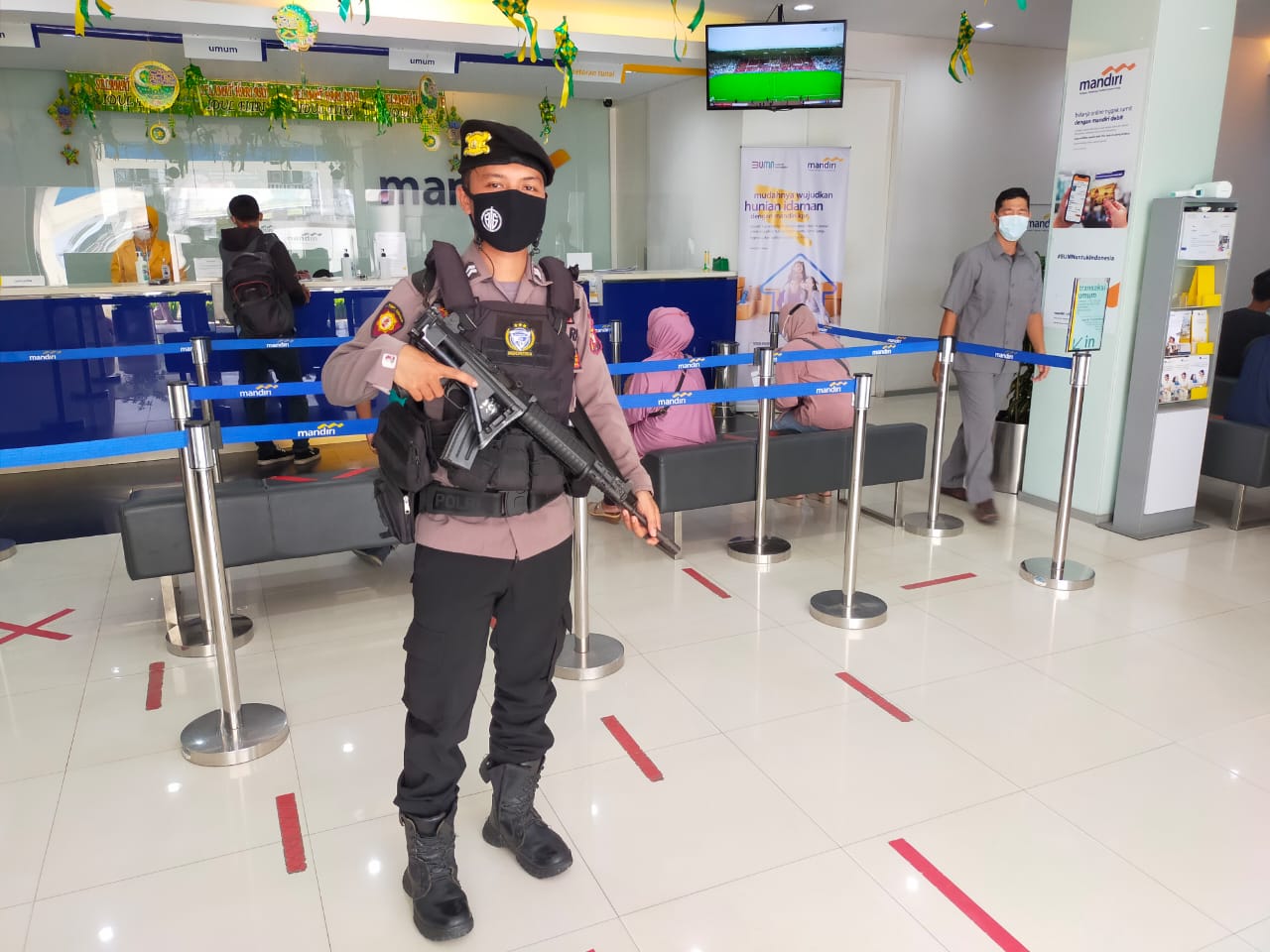 TRIBUNPONTIANAK.CO.ID, SAMBAS - Personel dari Satuan Sabhara Polres Sambas, Briptu Riandika melaksanakan pengamanan obyek vita, di antaranya melaksanakan pengamanan di Bank Mandiri cabang Sambas .