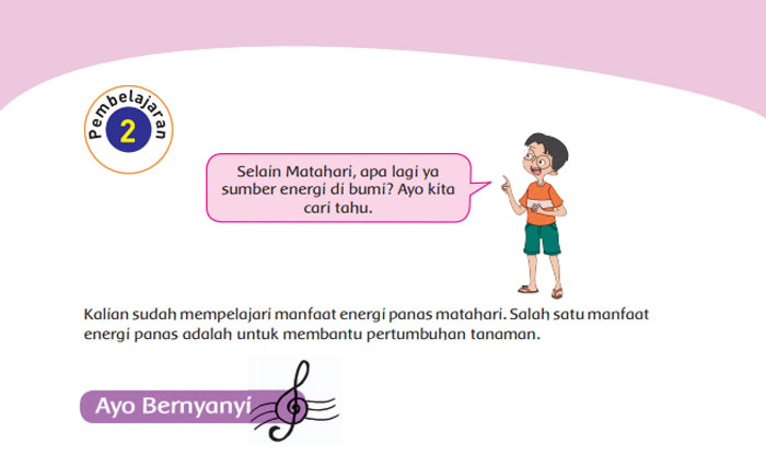 Pada buku tematik Tema 2 Kelas 4 SD terdapat 3 subtema diantaranya adalah Subtema 1 Sumber Energi, Subtema 2 Manfaat Energi, dan Subtema 3 Energi Alternatif