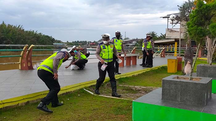 Terlihat Kasat Lantas beserta anggota Satlantas lainnya berbaur memungut sampah di sekitar waterfront Mempawah lokasi rutin Satlantas melakukan apel pagi.