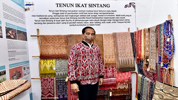 Dalam unggahan Presiden Jokowi, kain bermotif manok yang dikenakannya tersebut ditenun oleh pengerajin di Desa Umin Jaya dan penjahit dari UMKM Kota Sintang.