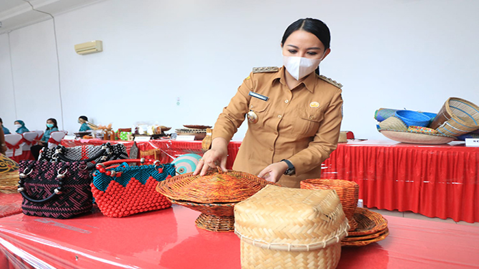 TRIBUNPONTIANAK.CO.ID, LANDAK - Bupati Landak Karolin Margret Natasa membuka acara display produk handicraf atau kerajinan tangan melalui Tim Penggerak PKK seluruh Kecamatan di Kabupaten Landak dalam rangka menggali potensi UP2K melalui IKM dan UMKM di Kabupaten Landak.