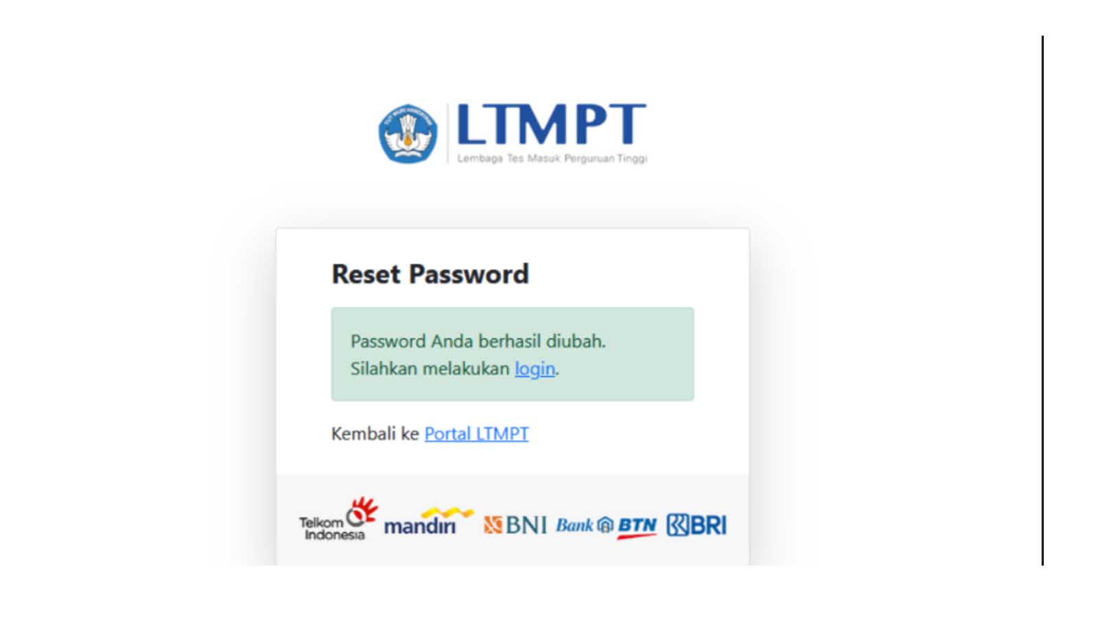 8. Setelah memasukkan password baru, maka akan muncul notifikasi sukses dan Anda dapat melakukan login kembali di Portal LTMPT.