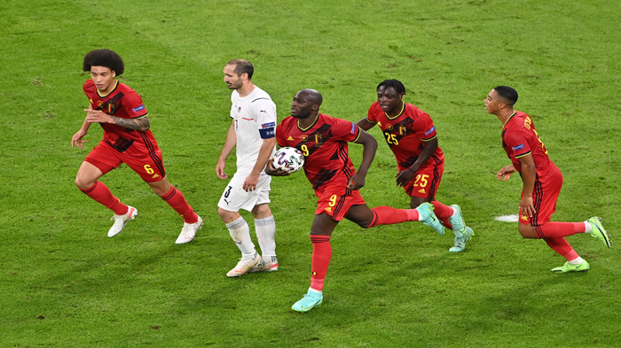 EURO - Striker Belgia Romelu Lukaku (tengah) membawa bola kembali ke titik tengah setelah mencetak gol balasan via eksekusi penalti pada pertandingan perempat final UEFA EURO 2020 antara Belgia vs Italia di Allianz Arena Munich, Jerman, Sabtu 3 Juli 2021 dini hari WIB. Babak pertama Belgia tertinggal 1-2.