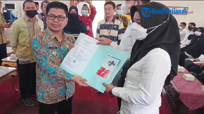 TRIBUNPONTIANAK.CO.ID, SAMBAS - Bupati Sambas H Satono, S.Sos, M.H menyerahkan secara simbolis SK Pengangkatan CPNS formasi tahun 2021 di Aula Utama Kantor Bupati Sambas, Kamis 2 Juni 2022.