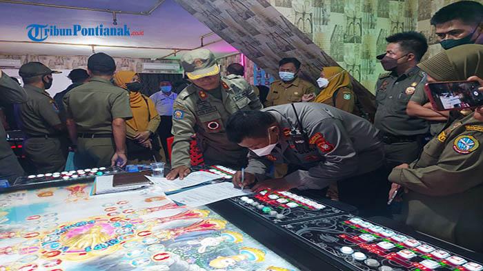 TRIBUNPONTIANAK.CO.ID, PONTIANAK - Satuan Polisi Pamong Praja Kota Pontianak bersama Kepolisian dan TNI menutup paksa sementara lokasi permainan mesin Ketangkasan yang berlokasi di jalan Siam Pontianak, Senin 4 Juli 2022 siang.