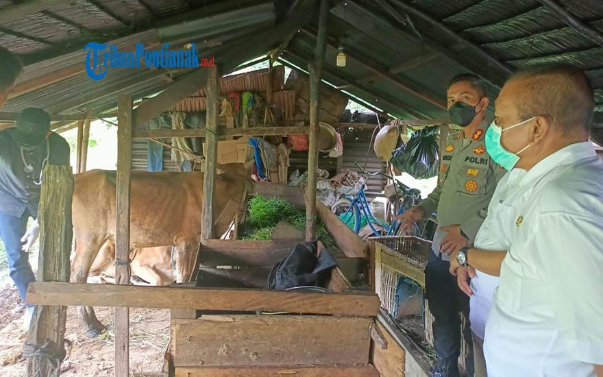 TRIBUNPONTIANAK.CO.ID, KAYONG UTARA - Kapolres Kayong Utara AKBP Arief Hidayat S.H., S.I.K yang didampingi Sdr. Azhari, S.Ip Kadis pertanian dan pangan serta di ikuti Kabag Ops dan Kasat Intelkam, Drh Ludi Nurmala Kabid peternakan Dinas Pangan serta petugas peternakan melakukan pengecekan kandang sapi milik Sidin dusun Tanjung Belimbing desa Pangkalan Buton Sukadana, Kamis 7 Juli 2022.