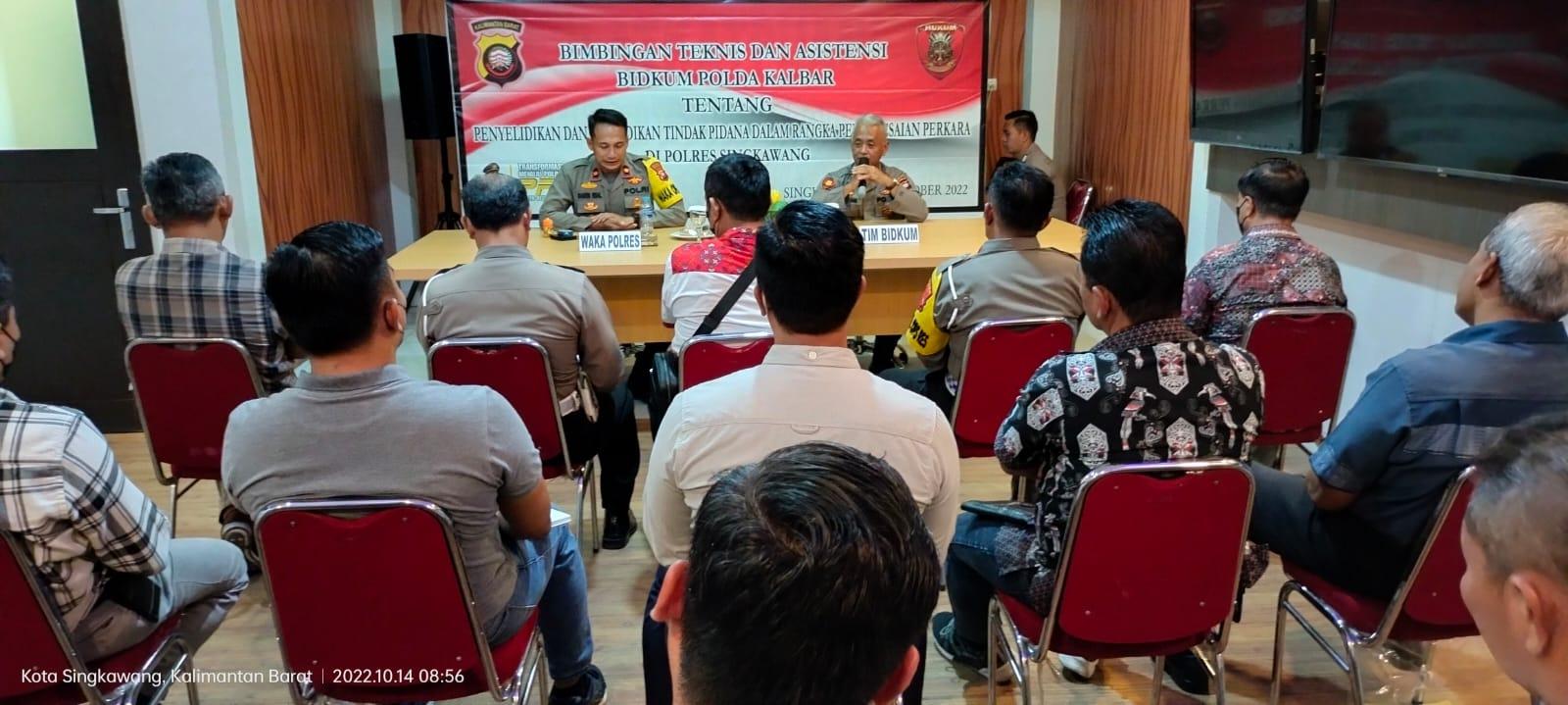 TRIBUNPONTIANAK.CO.ID, SINGKAWANG - Bidang Hukum Polda Kalimantan Barat melaksanakan kegiatan Bimbingan Teknis dan Asistensi tentang Peyelidikan dan Penyidikan Tindak Pidana di Polres Singkawang, kegiatan dilaksanakan di ruang Monitoring Center Polres Singkawang di Jalan Firdaus H.R.II Kota Singkawang, Jumat 14 Oktober 2022.