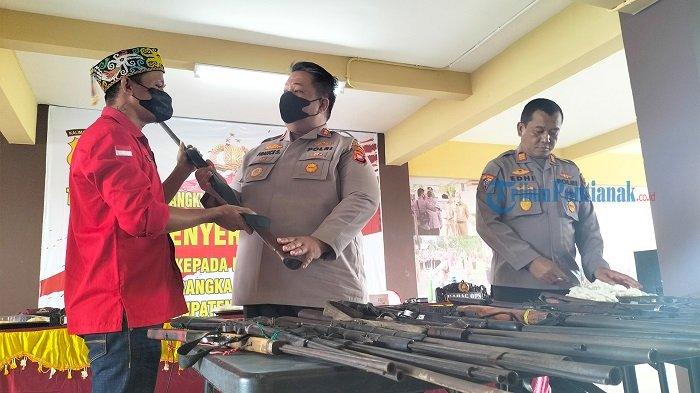TRIBUNPONTIANAK.CO.ID, KAPUAS HULU - Masyarakat Kapuas Hulu telah menyerahkan sebanyak 27 pucuk senjata api (senpi) rakitan melalui Tariu Borneo Bangkule Rajakng (TBBR) DPC Kapuas Hulu ke Polres Kapuas Hulu pagi ini, Rabu 2 November 2022.