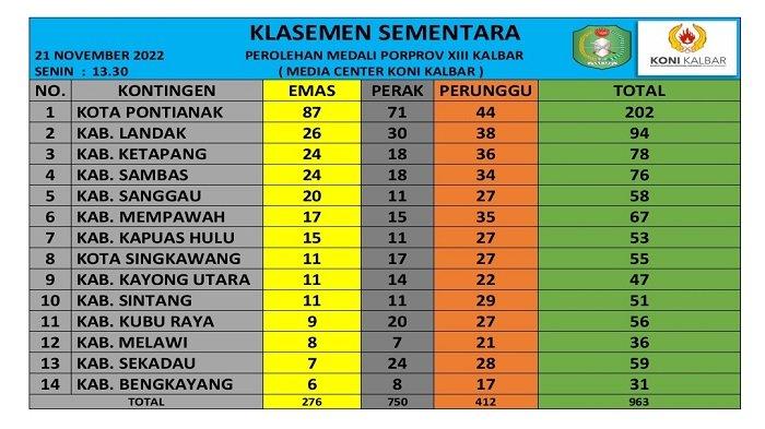Berikut daftar perolehan medali sementara Porprov Kalbar 2022 per Senin 21 November 2022 pukul 13:30 WIB: