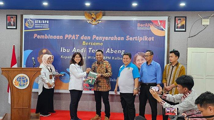 Sertipikat yang telah terbit diserahkan langsung oleh Kepala Kantor Pertanahan Wilayah Provinsi Kalimantan Barat, Andi Tenri Abeng kepada Manager Unit Pelaksana Proyek KLB 1, Oki Hermawan di Kantor Pertanahan ATR/BPN Kabupaten Sekadau, Rabu (14/6/2023).
