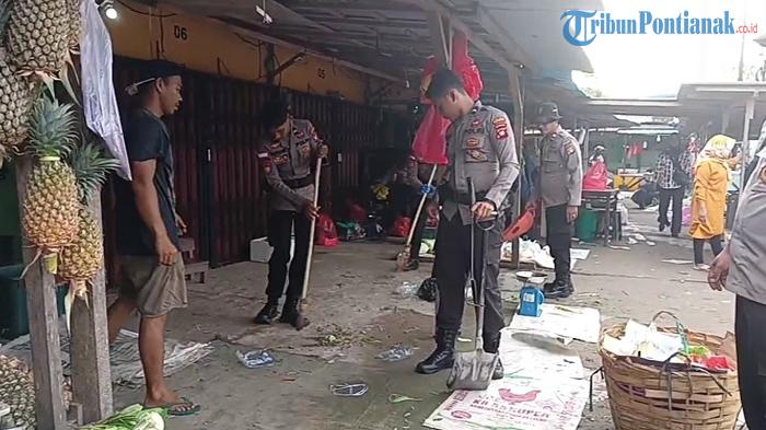 TRIBUNPONTIANAK.CO.ID, SAMBAS - Personel Kepolisian Polres Sambas bersama TNI, instansi terkait dan warga Pedagang pasar pagi bahu membahu membersihkan lingkungan pasar pagi, Kecamatan Sambas, Kabupaten Sambas, Kamis 13 Juli 2023.